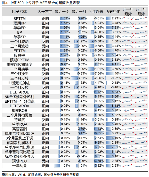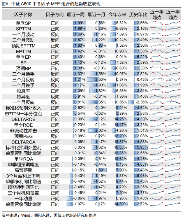 我们以中证A500指数为样本空间,对常见选股因子构造其相对于中证A500指数的MFE组合并跟踪其表现,具体表现如下图。