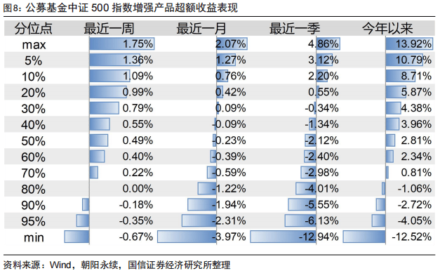 我们对统计区间内上市满三个月的公募基金指数增强产品的超额收益进行跟踪,主要包括沪深300指数增强产品、中证500指数增强产品、中证1000指数增强产品及中证A500指数增强产品,在计算区间超额收益时,我们以95%*基准指数收益率作为业绩基准。