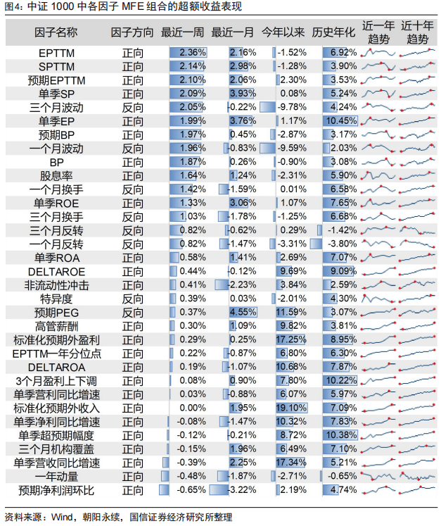 我们以中证1000指数为样本空间,对常见选股因子构造其相对于中证1000指数的MFE组合并跟踪其表现,具体表现如下图。