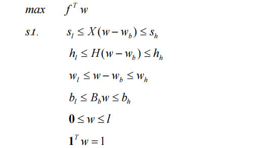 第一个约束条件限制了组合相对于基准指数的风格暴露,X为股票对风格因子的因子暴露矩阵,wb为基准指数成分股的权重向量,sl、sh分别为风格因子相对暴露的下限及上限;