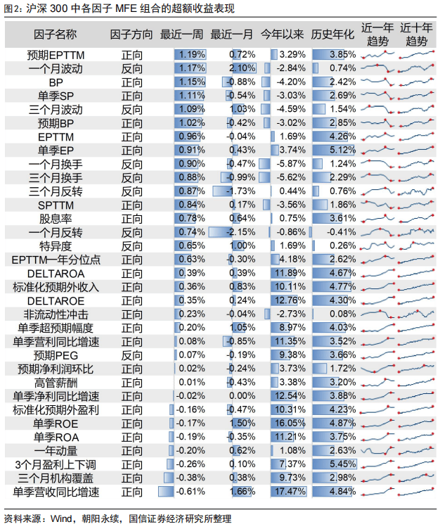 我们以沪深300指数为样本空间,对常见选股因子构造其相对于沪深300指数的MFE组合并跟踪其表现,具体表现如下图。