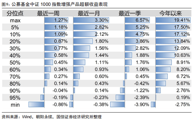 中证1000指数增强产品本周超额收益最高1.27%,最低-0.86%,中位数0.45%。