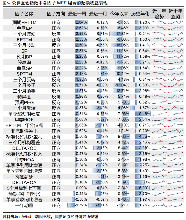 我们以公募重仓指数为样本空间,对常见选股因子构造其相对于公募重仓指数的MFE组合并跟踪其表现,近期表现如下图。
