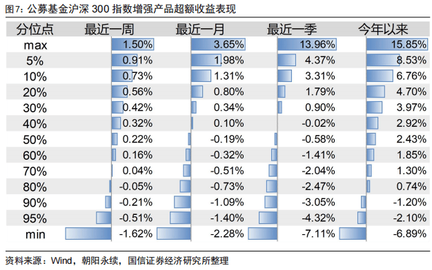 沪深300指数增强产品本周超额收益最高1.50%,最低-1.62%,中位数0.22%。