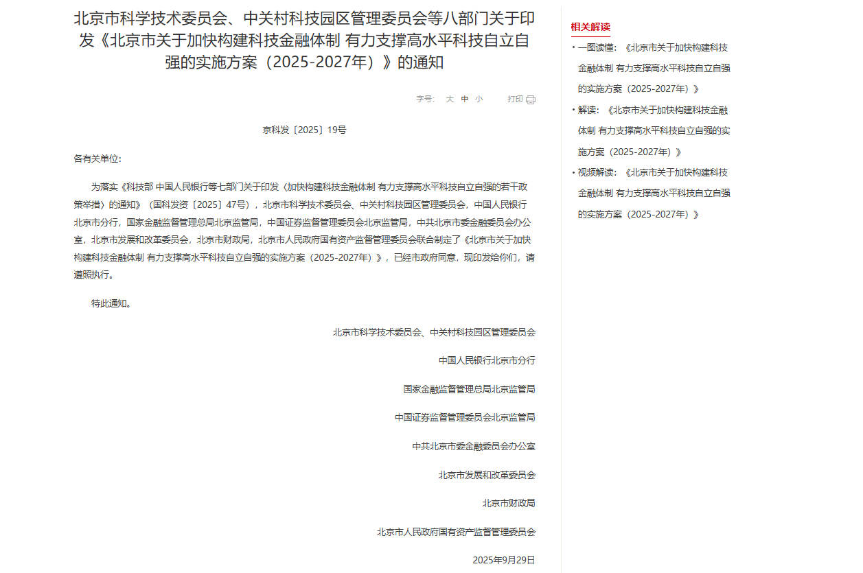 北京市关于加快构建科技金融体制 有力支撑高水平科技自立自强的实施方案(2025-2027年)