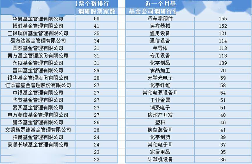 近一个月(12月17日-1月16日),华夏基金参与公司调研的数量最多,共调研50家上市公司,此外调研较为活跃的还有博时基金、工银瑞信基金和易方达基金,分别调研41家、35家、34家上市公司;从调研行业上来看,基金公司对汽车零部件行业的上市公司调研次数最多,共有155次,其次是医疗器械行业,基金公司调研了152次。