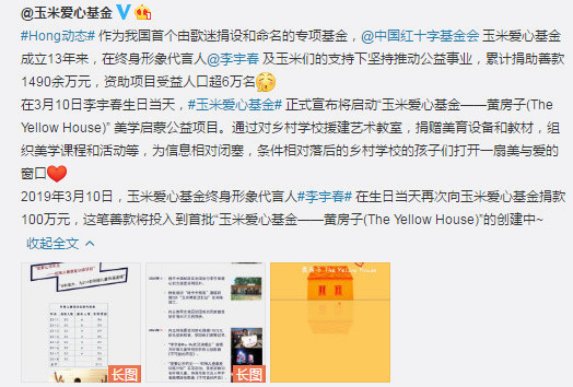 2026-01-19博鱼体育,博鱼体育官方网站,博鱼体育APP下载3月10日是李宇春35岁的生日,粉丝自发在她的微博评论区晒出做公益的截图,以做公益的形式为偶像庆祝生日。当天“玉米爱心基金”宣布将启动“黄房子”儿童美学启蒙公益项目,对乡村学校援建艺术教室、捐赠美育设备和教材、组织美学课程和活动等,李宇春也在生日当天向玉米爱心基金捐款100万。