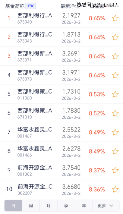 2日开放式基金净值增长排名前10的基金分别是:西部利得行业主题优选混合A、西部利得新动力混合C、西部利得新动力混合A、西部利得行业主题优选混合C、西部利得策略优选混合C、西部利得策略优选混合A、华富永鑫灵活配置混合C、华富永鑫灵活配置混合A、前海开源金银珠宝混合A、前海开源金银珠宝混合C。
