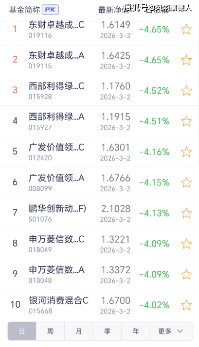 2日开放式基金净值增长排名后10的基金分别是:东财卓越成长C、东财卓越成长A、西部利得绿色能源混合C、西部利得绿色能源混合A、广发价值领先混合C、广发价值领先混合A、鹏华创新动力混合(LOF)、申万菱信数字产业股票型发起式C、申万菱信数字产业股票型发起式A、银河消费混合C。