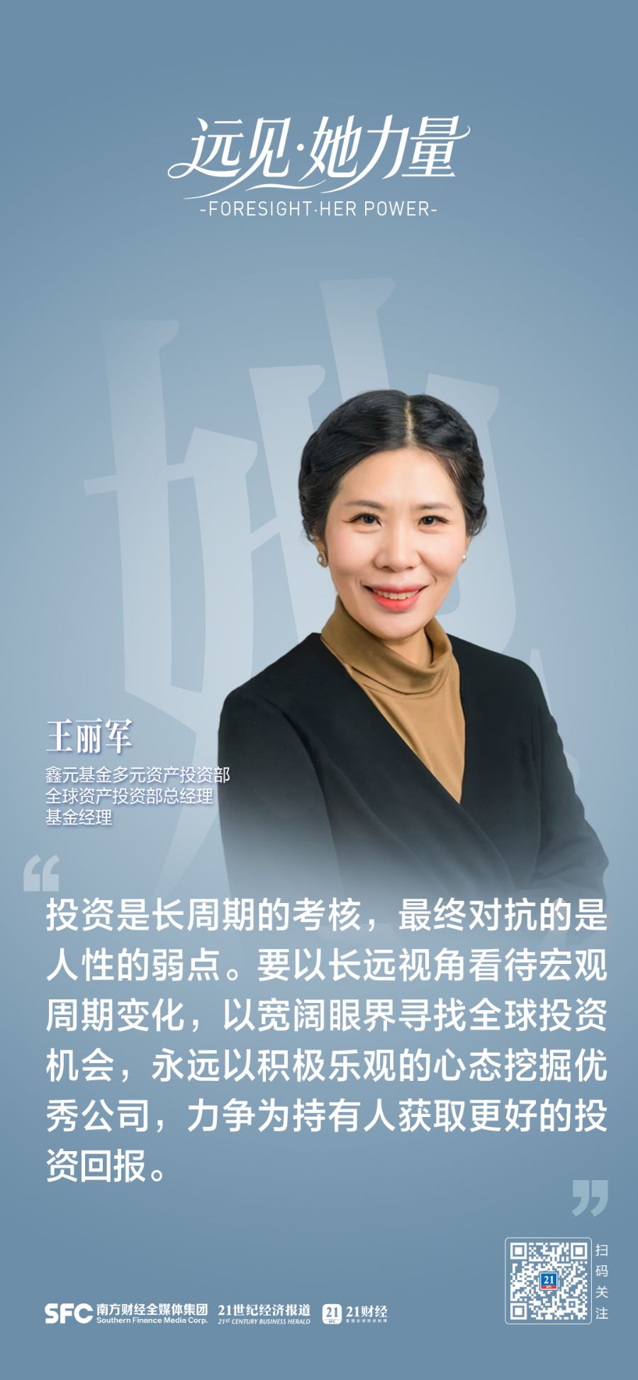 王丽军:我是一个非常乐观的人,始终保持持续学习、不断积累的状态。从业近20年来,我先后覆盖地产、大消费、互联网、周期和海外大宏观等多个领域,始终积极拥抱市场变化,坚持终身学习,与时代同频前行。