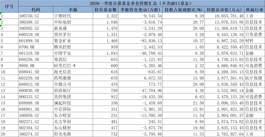 资金的流向上,今年一季度,在中东局势引发的剧烈扰动下,避险情绪和产业趋势两个方向出现拉扯,机构共识聚焦硬科技和资源,AI算力(中际旭创、新易盛)与新能源(宁德时代)成核心抱团方向。