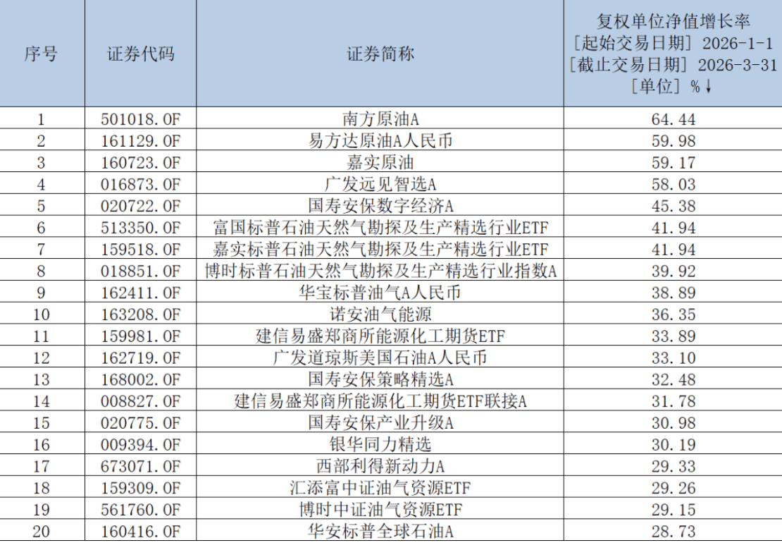 一季度,中东地缘冲突导致市场波动较大,从一季度基金业绩排名来看,能源类基金“霸榜”的特征非常明显,业绩排名前5的基金中,有三只主要投资方向就是原油。在排名前20的基金中,超过八成集中于原油、天然气及能源化工。其中,南方原油、易方达原油等原油主题基金收益率均超过50%,领跑全市场;富国、嘉实等旗下的标普石油天然气勘探及生产ETF紧随其后,收益率达40%+。