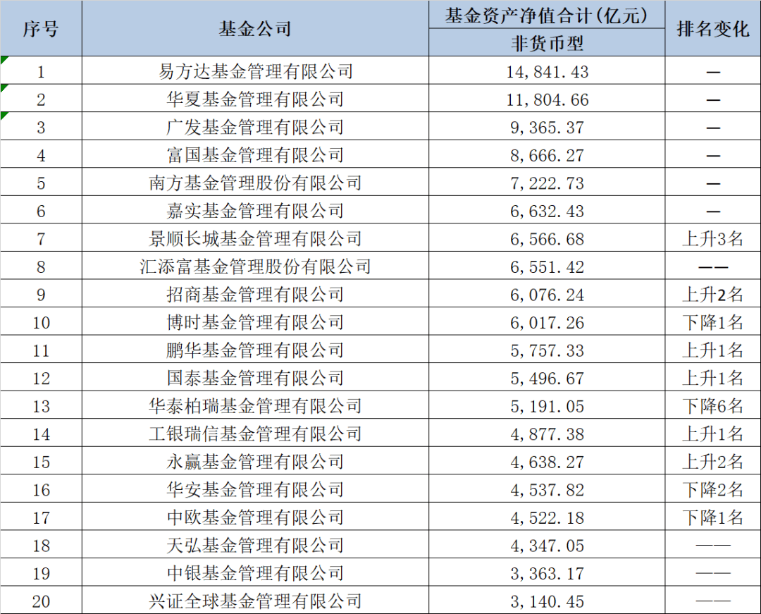 基金规模上,在剔除货币基金后的非货规模排名中,头部效应依然显著,但内部排位已发生微妙变化。