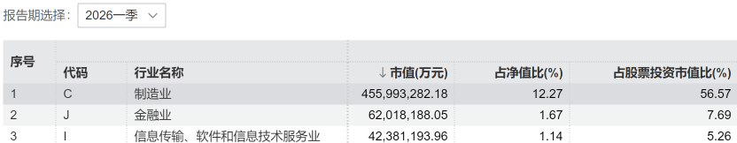 根据2026年一季报,公募基金持仓行业高度集中于制造业。从持股市值行业配置来看,制造业以56.57%的占比遥遥领先,为机构核心配置方向;其次是金融业,占比7.69%,稳居第二,体现防御性配置需求;信息传输、软件和信息技术服务业占比为5.26%,是机构布局科技成长的重要方向。